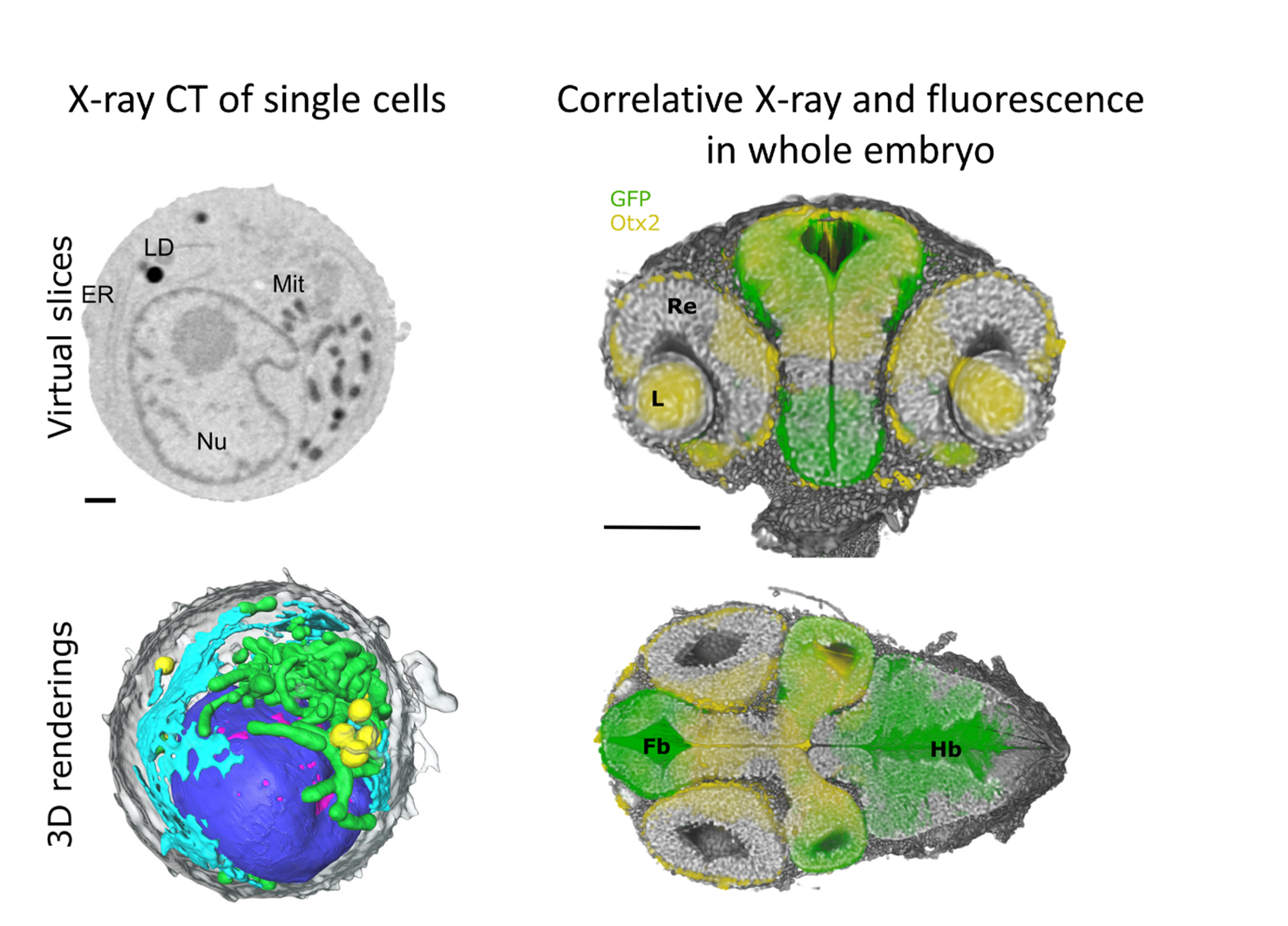 Morphometric data on cells are of limited use without knowledge of their functions. Physiological processes such as movement, ion transport, and metabolism, including protein location and associations, are typically visualized by fluorescent light microscopes. Therefore, we are working on the correlation of light and X-ray microscopy. Within the MSCA-DN CLEXM project [link], we integrate full-rotation soft X-ray tomography (SXT)—established for isotropic 3D cellular ultrastructure—with axial super-resolution fluorescence microscopy adapted for thin glass-wall capillaries. Full-rotation tomography uniquely delivers isotropic nanometer-scale 3D data, combining SXT's label-free, quantitative density mapping (e.g., distinguishing hetero- from euchromatin via X-ray absorption) with fluorescence for molecular specificity, to probe dynamic chromatin reorganization in biological processes.