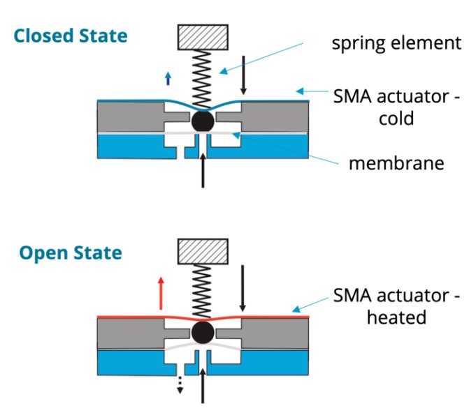 Fig. 1. An example of thermal shape memory actuator acting as a fluidics valve. When the current is switched on (actuator heated), the actuator made of a shape memory alloy acts against a spring element, thus releasing a ball from the valve opening. When the current is switched off, the spring element pushes the ball back onto the valve opening.